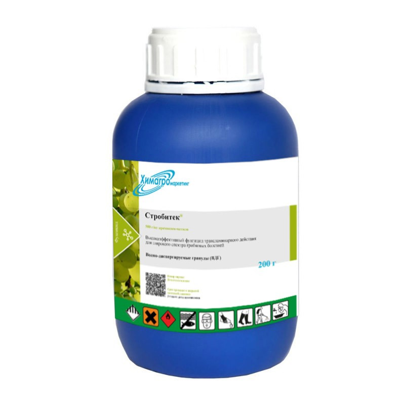 Фунгицид защитного, лечебного и искореняющего действия, высокоэффективный против широкого спектра грибов, которые относятся к классам аско-, базидио-, дейтеро- и оомицетам Действующее вещество: крезоксим-метил, 500 г/кг Спектр действия: классы: оомицеты, аскомицеты, базидиомицеты, дейтеромицеты Форма препарата: водно-диспергируемые гранулы Химический класс: стробилурины Период защитного действия: 7-12 суток Свойства и преимущества: Стробитек — контактный фунгицид с лечебным действием и частичным локально-системным эффектом. Обладает трансламинарной активностью. Высокоэффективен при применении даже по мокрой листве и в условиях крайне низких положительных температур (+1 – +4°C). Стробитек применяют только в системе с другими фунгицидами, инсектицидами в связи с фотохимической нестабильностью, а также высокой летучестью. Препарат необходимо применять с фунгицидами с другим механизмом действия. Не проявляет фитотоксичности на растениях оидиум, милдью, мучнистая роса, ржавчина, пятнистости, мучнистая роса, пероноспороз, мучнистая роса, ржавчина, американская мучнистая роса, антракноз, ржавчина, септориоз, мучнистая роса, фитофтороз, парша, мучнистая роса, сажистый грибок, мухосед, курчавость листьев, альтернариоз, пятнистость листьев, гнили плодов при хранении (монилиозная, пенициллезная, горькая, плесневидная). Производитель оставляет за собой право изменять характеристики товара, его внешний вид и комплектность без предварительного уведомления продавца.